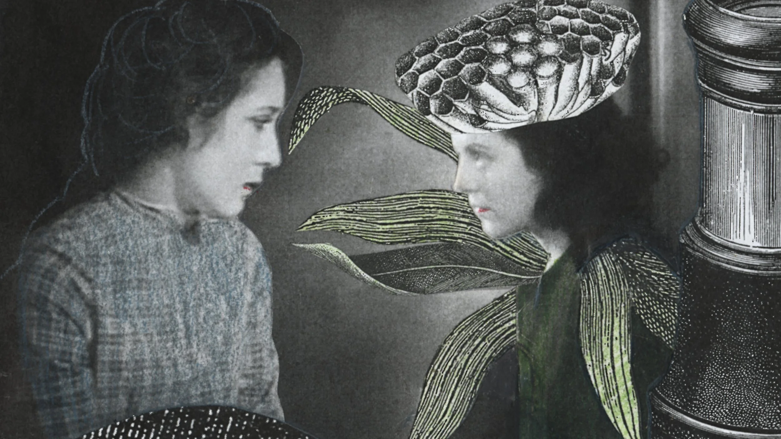 Mary Pickford and Janet Gaynor, seamlessly lifted from early silent films, are cast into a surreal epic with an upending of the Frankenstein story and a contemporary undercurrent of hive collapse. In this handmade film, Stacey Steers selects sequences from early cinematic sources, prints the frames, and re-contextualizes the action, allowing the “story” assembled from appropriated images to evolve. She inserts her actors into newly imagined collage environments, built by hand from fragments of 19th century engravings and illustrations. Edge of Alchemy is the third film in a trilogy examining women’s inner worlds. Music by the Polish composer Lech Jankowski.